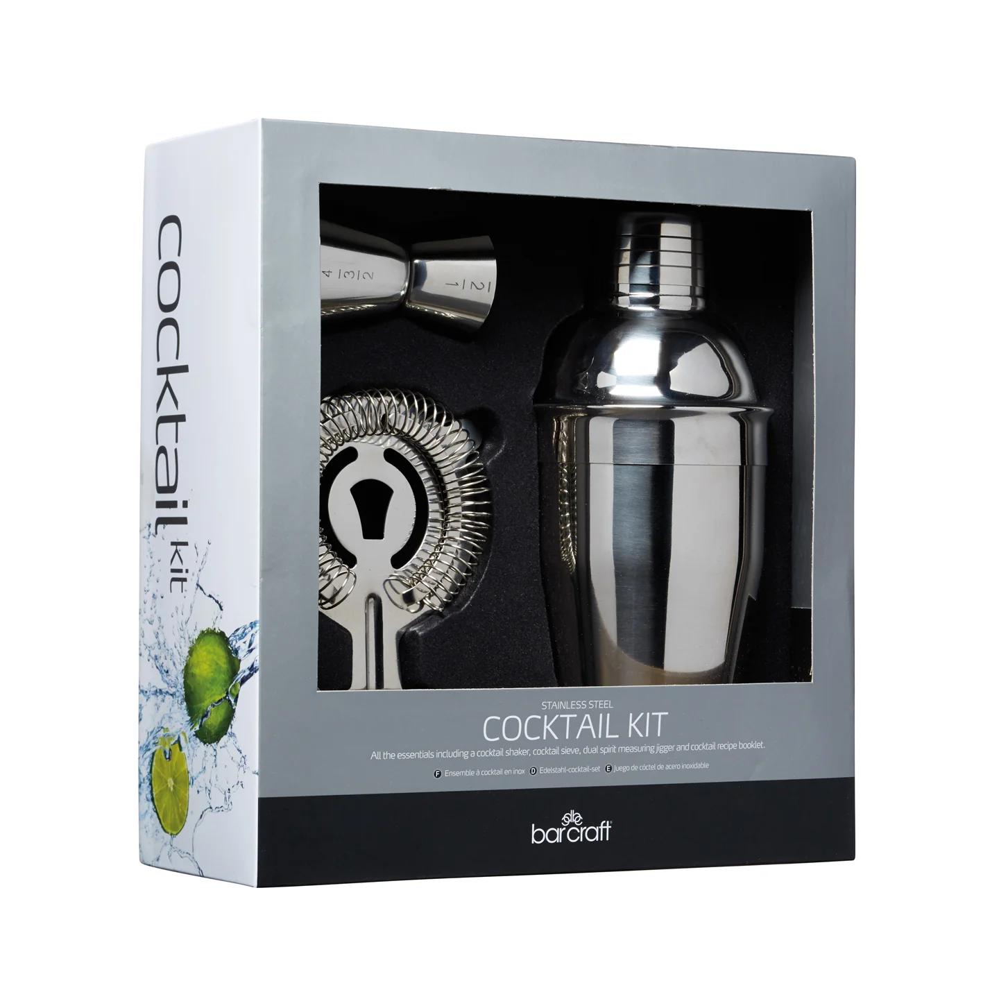 Crafted from stainless steel, this BarCraft Stainless Steel 3 Piece Cocktail Set includes a cobbler shaker, a Hawthorne strainer and a double-sided jigger. Plus, it comes with a recipe book to help you perfect your mixology skills. Presented in a gift box.