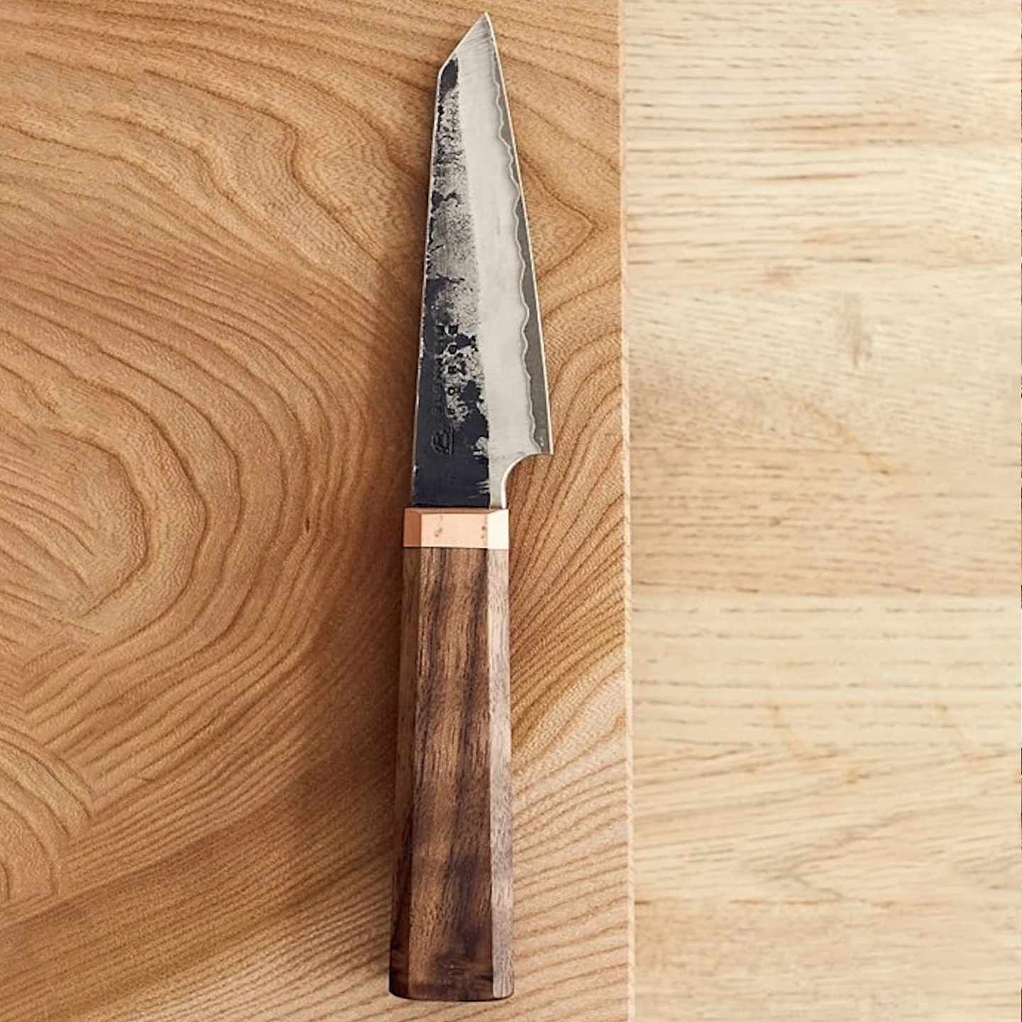 ---DETAILS--- Located in a small workshop under an archway in South London, Blenheim Forge is a jewel in Britain’s culinary landscape, beloved by chefs like Gordon Ramsey and Francis Mallmann. We collaborated on a collection of knives made with a core Japanese super blue carbon steel—known for its long-lasting durability and unparalleled sharpness—clad with rust-proof stainless steel until the edge of the blade for easier maintenance. It is notoriously difficult to forge super blue carbon steel, but Blenheim Forge has mastered it with their skill and attention to detail. Every knife has a comfortable, six-sided walnut handle that feels stable to hold and provides balance, attached with a beautiful copper ferrule. The wood is sustainably sourced from fallen trees in the M25 area by an enterprise that teaches joinery and furniture making to unemployed youth.