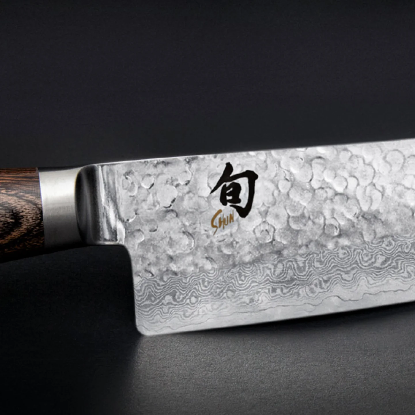 This set of two knives from the Kai Shun Premier collection features two of the most versatile knives in any chef's collection. The 18cm santoku knife has an almost straight edge, making it ideal for slicing, dicing, chopping vegetables, as well as mincing herbs. The slender 16.5cm utility knife is perfect for tasks that don't require large blades. With a core of VG MAX steel, these knives retain a razor-sharp edge in between sharpening sessions. This core is then clad within 32 layers of Damascus steel, before being hammered to create a stunning visual effect known as tsuchime. The handles are crafted from pakkawood and are ergonomically shaped to fit comfortably into the palm of your hand, ideal for both left and right-handed users. Designed by German chef Tim Mälzer, these knives designed to work hard, with utmost precision.