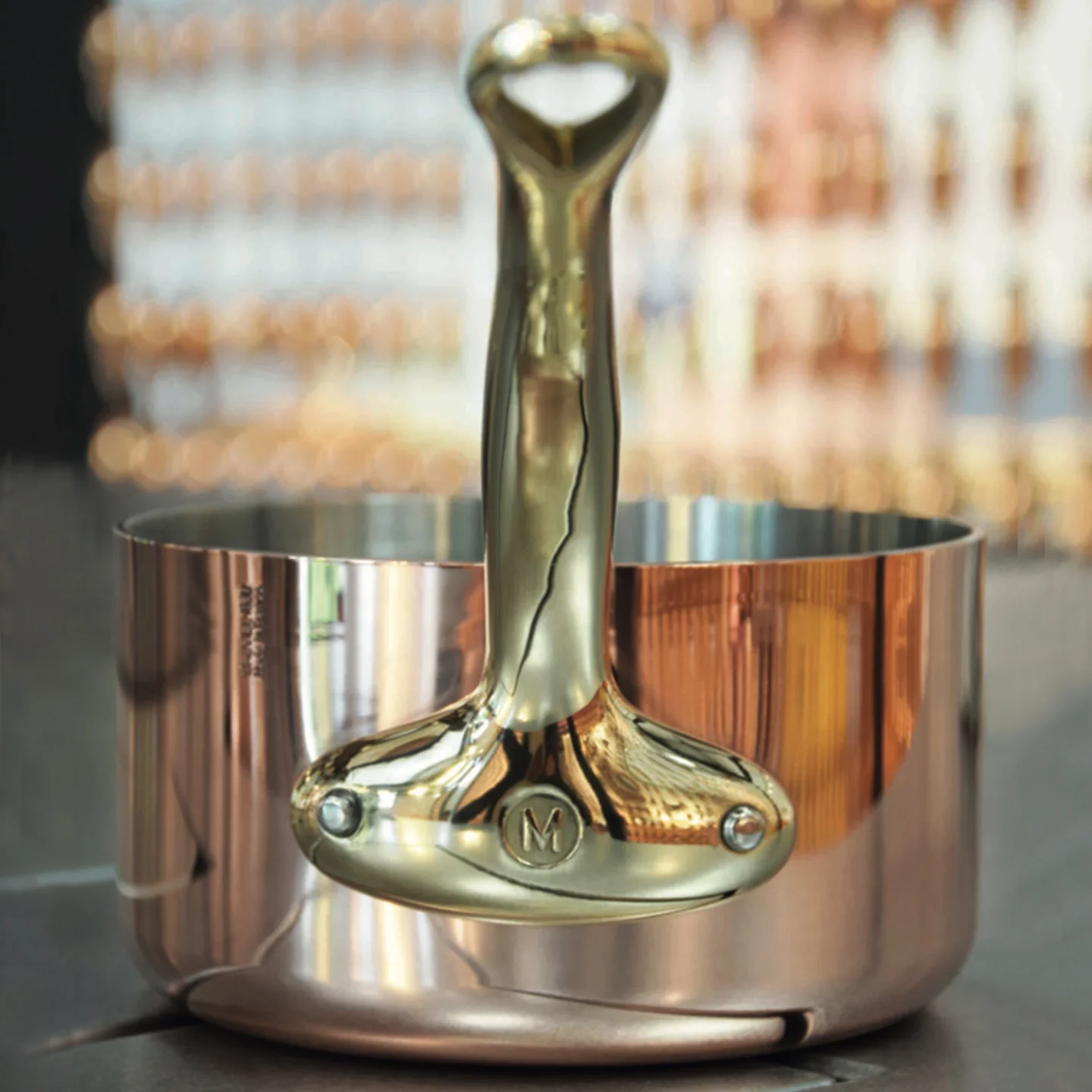 Mauviel’s M’200B range of copper cookware is designed to match the demands of busy restaurant kitchens. Copper, an exceptional conductor of heat, allows even, controlled cooking that responds to the slightest changes of temperature instantly. This range features a thick 2mm layer (90%) that puts this unique capability front and centre, resulting in maximum heat-responsiveness but enhanced usability, as it is lighter than most professional-grade copper pans. The other 10% of the pan is made from ultra-durable stainless steel that is easy to clean and never needs to be ‘re-tinned’. The bronze handles, which have a gold finish, add an undeniably beautiful aesthetic. These pans are built to withstand heavy use and still be passed down to generations. Suitable for all hobs except induction; it is not dishwasher safe. This set contains: