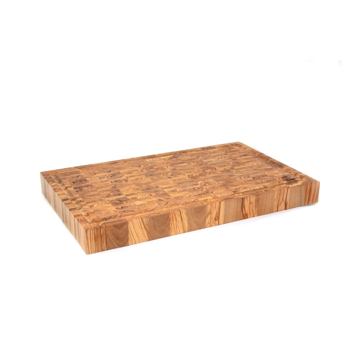 This Olivewood End Grain Carving Board comes to us from Arte Legno in Italy. The board can be used on both sides: one side features a juice groove for use as a carving board and the other has a smooth side for use as a chopping board. With proper care, it will last a lifetime.
